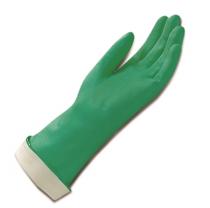 Guanto in nitrile - Interno floccato cotone. Adatto alla produzione ed applicazione di pitture e vernici e per il trattamento di metalli con solventi. Certificazione: rischi irreversibili, cat.3. EN 388-374 CE Colore verde; Lunghezza 320 mm; Spessore 0,45 mm